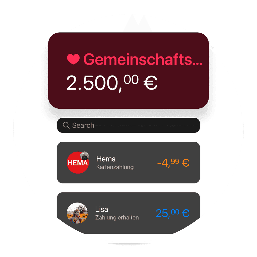 Nie mehr „Wer hat was bezahlt?“ Du weißt genau, wo dein Geld hingeht. Lass dein Gehalt sortieren, Einkäufe kategorisieren und übrig gebliebenes Geld automatisch auf dein Gemeinschafts-Sparkonto überweisen.