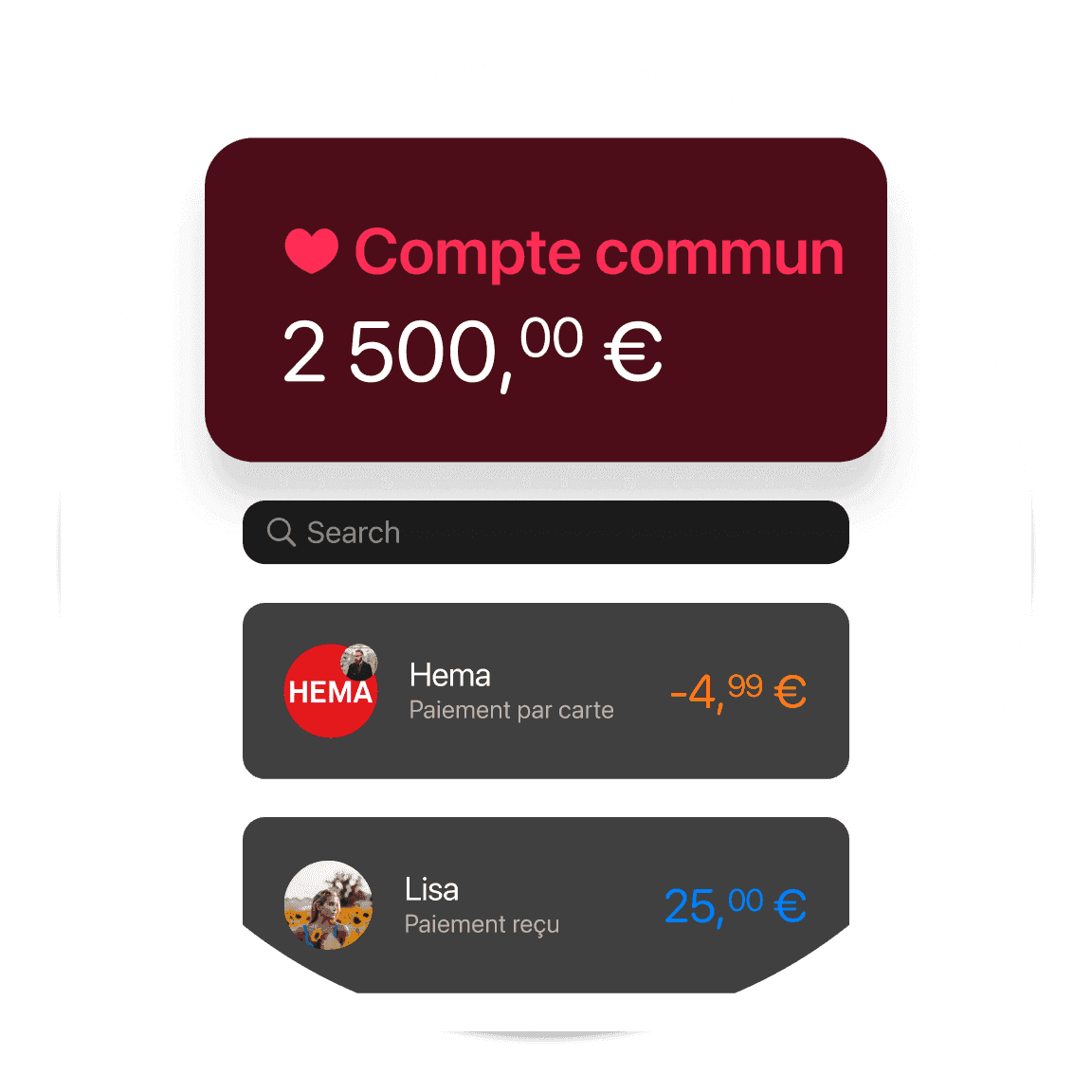 Plus de "Qui a payé quoi ?" Sache exactement où va ton argent. Fais en sorte que ton salaire soit organisé, tes achats catégorisés, et que le solde soit automatiquement ajouté au compte d'épargne commun.